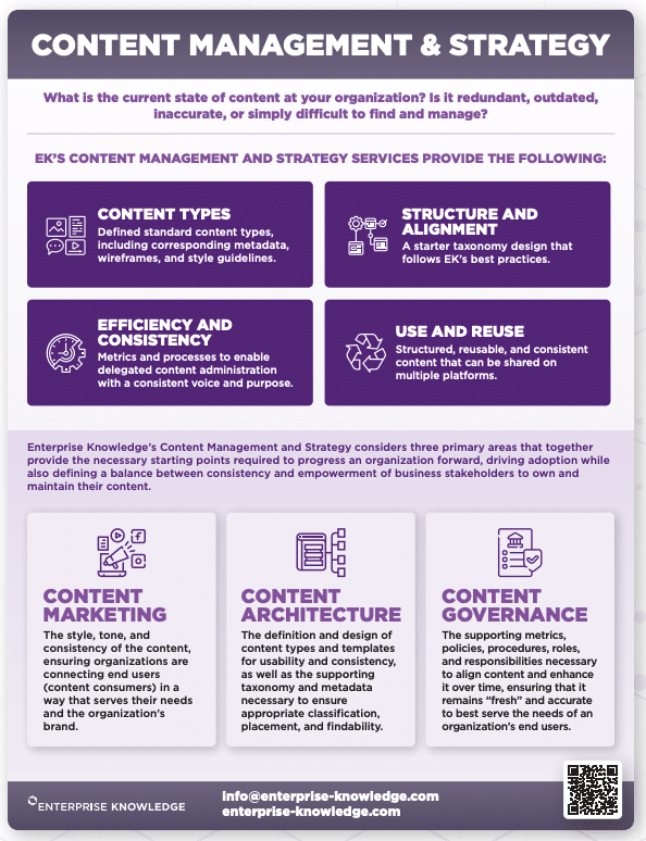 Enterprise Knowledge provides knowledge and content management consulting to some of the most innovative companies in the world. We’ll help you create the environment you need to provide both your customers and your employees with the consistent and accurate information they need to be successful. We apply content design and engineering best practices to deliver consistent content across internal and external channels, enabling employee performance and customer satisfaction.