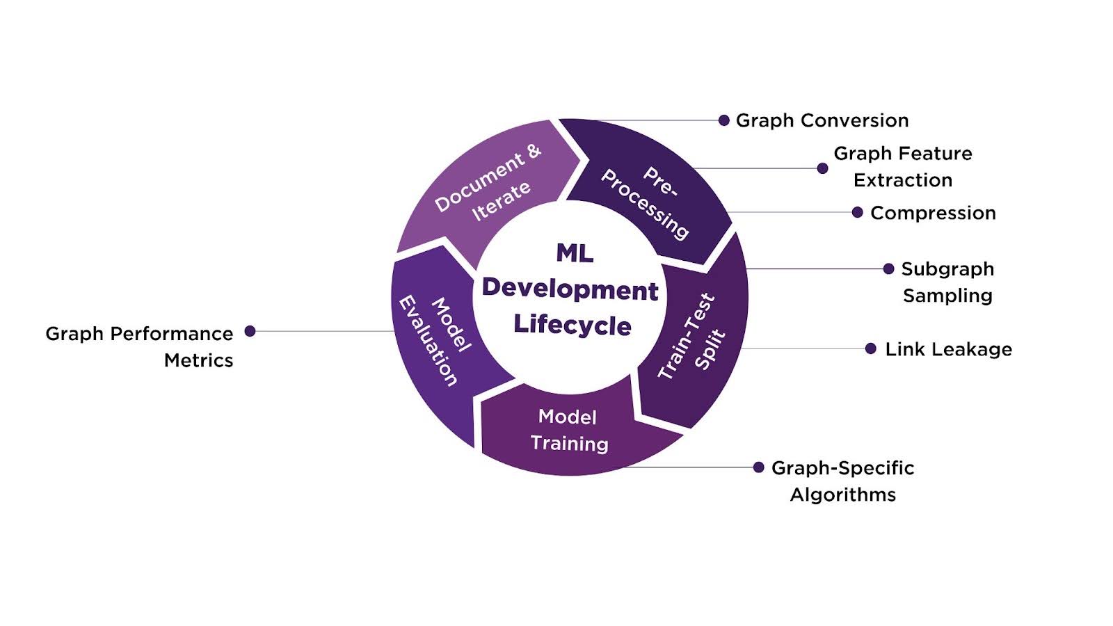 Take a moment to review the ML development lifecycle wheel above. The wheel is divided into five distinct sections: Pre-Processing, Train-Test Split, Model Training, Model Evaluation, and Document and Iterate. Below, we start with Pre-Processing, where we transform raw data into a graph structure, extract critical graph features, and apply compression techniques to manage complexity. Each subsequent section will build on these foundations by detailing the specific approaches and methodologies used in Train-Test Split, Model Training, and Model Evaluation. The wheel serves as our roadmap for understanding how Graph Machine Learning allows for deeper insights from complex, interconnected data.
