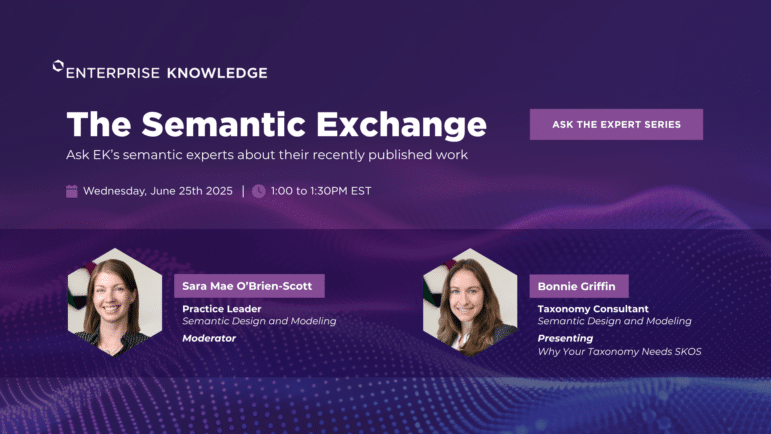 Enterprise Knowledge is pleased to introduce a new webinar series, The Semantic Exchange. We’re kicking off a five part series where we invite fellow practitioners to tune in and hear more about work we’ve published from the authors themselves. In these moderated sessions, we invite you to ask the authors questions in a short, accessible format. Think of the series as a chance for a little semantic snack!