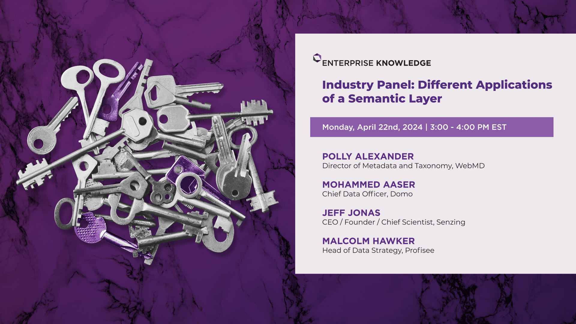Join a collection of the world’s most prominent voices in data science, information management, and artificial intelligence to discuss the role of Semantic Layers, what they are, and what value they offer organizations in the quickly changing world being shaped by the AI Revolution. In this webinar, Enterprise Knowledge Vice President Lulit Tesfaye will facilitate a spirited conversation with Malcom Hawker, Polly Alexander, Mohammed Aaser, and Jeff Jonas. Over the course of the webinar, the expert panelists will share their views on the state of the industry and discuss real-world applications and implementations of a Semantic Layer.